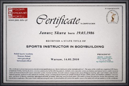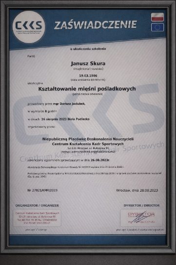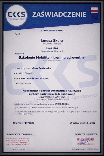 Zdobyte dyplomy i certyfikaty potwierdzają kompetencje, które każdego dnia wykorzystuję w pracy z klientami – pomagając im bezpiecznie poprawiać zdrowie, sylwetkę, sprawność oraz jakość życia